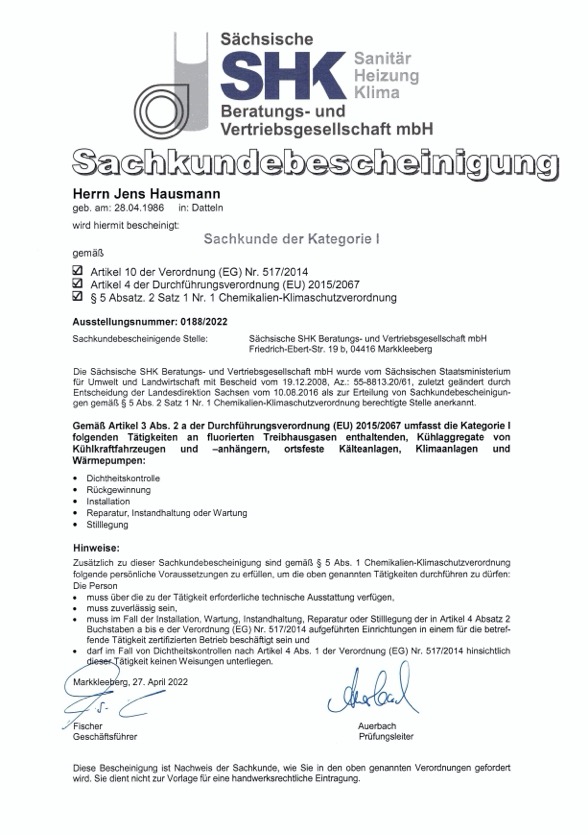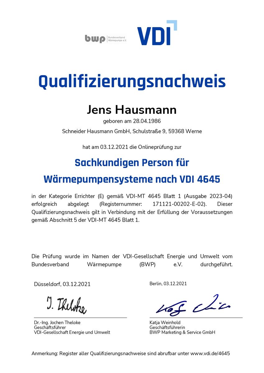 Jens Hausmann ist gelernter Sanitär- und Heizungsbaumeister mit Weiterbildungen als Immobilientechniker sowie als Sachkundiger für Wärmepumpenanlagen nach VDI 4645.
